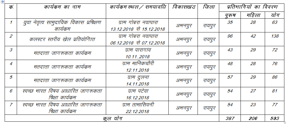 अभनपुर में आयोजित कार्यक्रम में सम्मिलित प्रतिभागियों का विवरण निम्नानुसार है -: