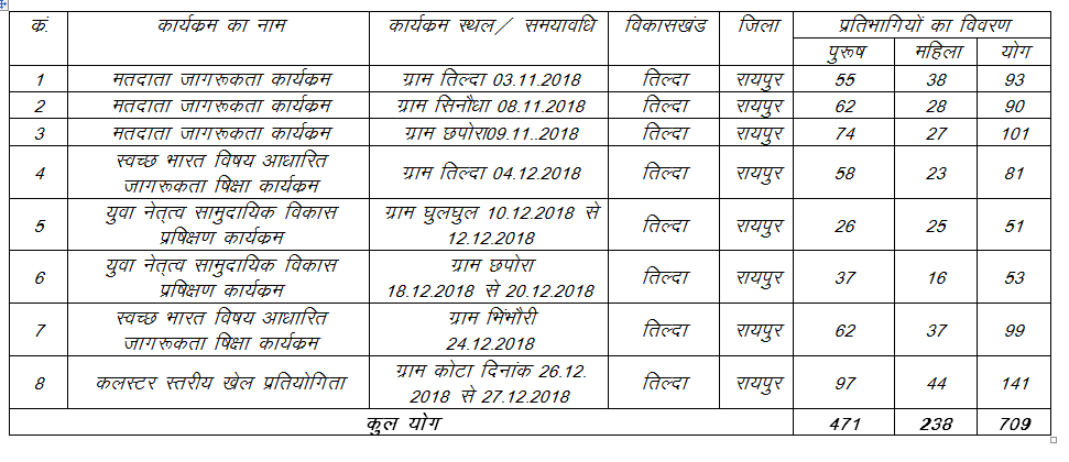 तिल्दा में आयोजित कार्यक्रम में सम्मिलित प्रतिभागियों का विवरण निम्नानुसार है